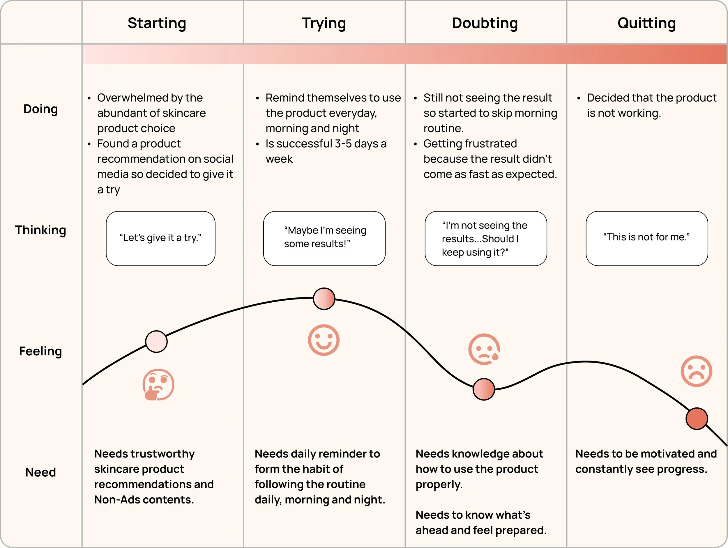 This is an overview of skincare users’ life in the journey for trying new skincare routine for their existing skin problems. The user scenario helps identity the needs of skincare users and what are strongest pain points we can improve upon.