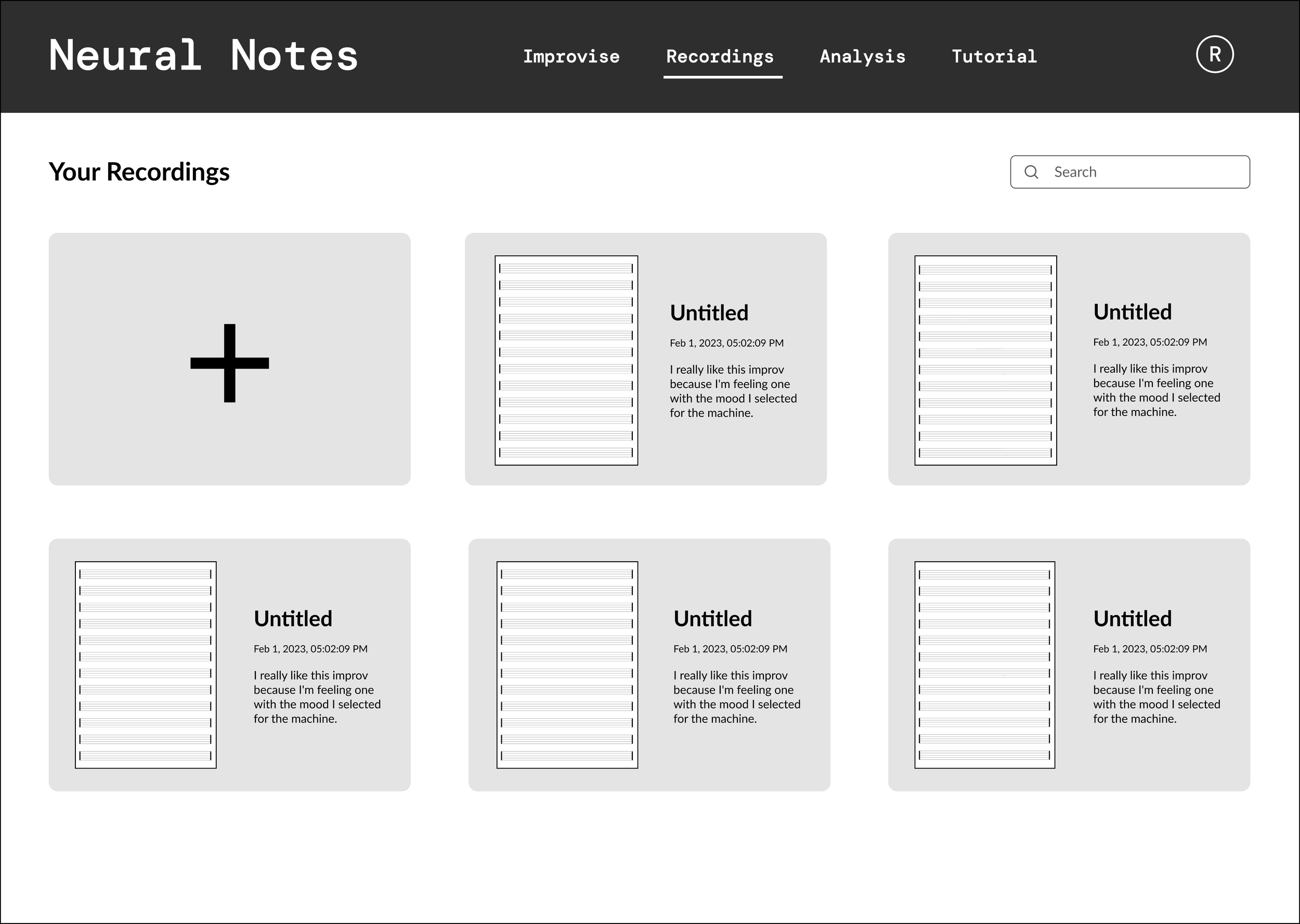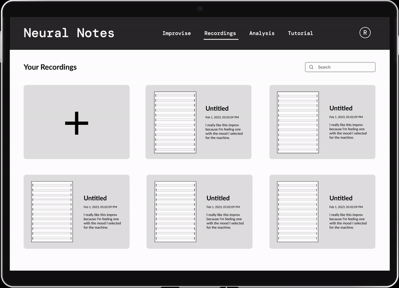 A recordings page, where users can revisit their past improvisations, and duplicate the same setting to create new improvisations.