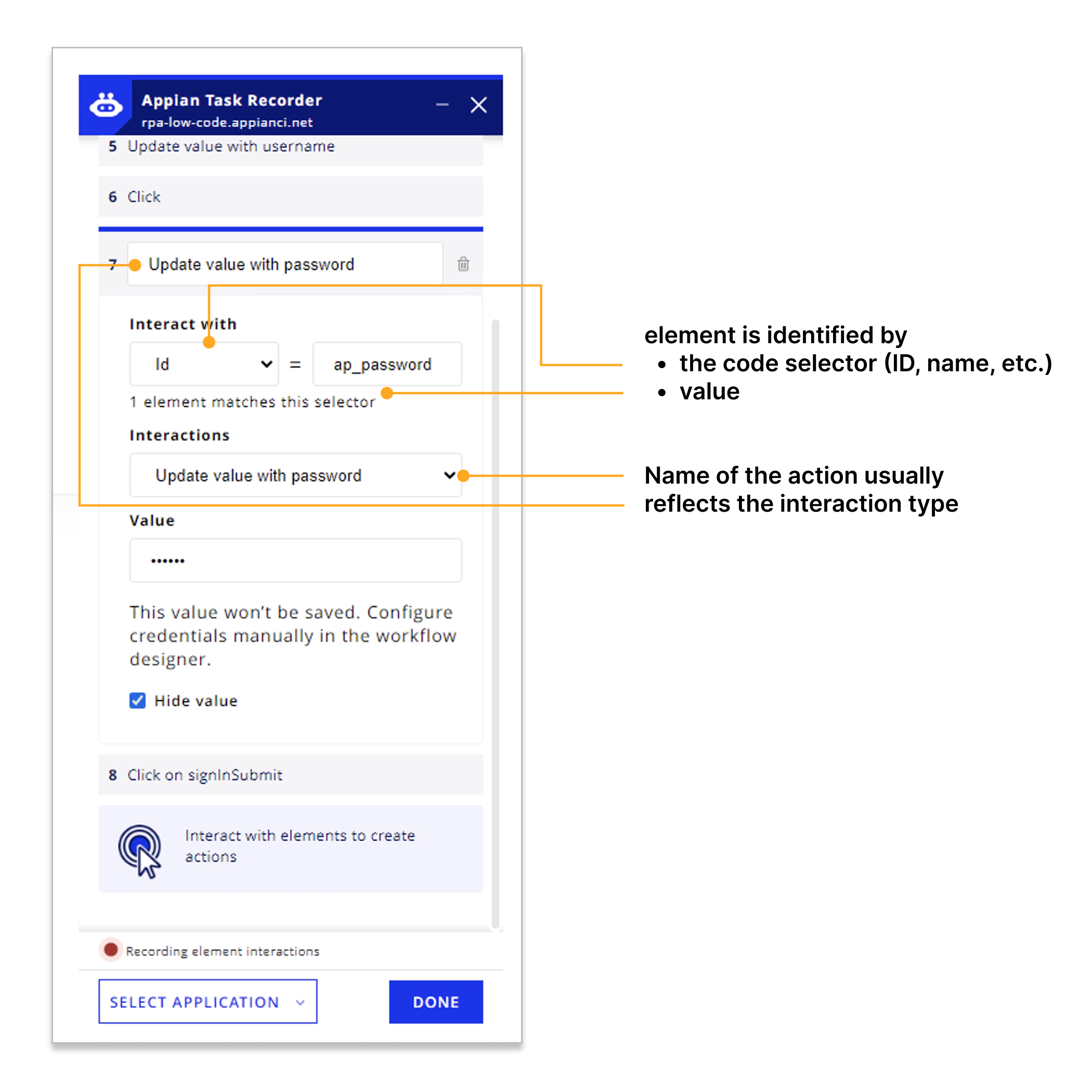 To record the task, users can use the Task Recorder to automatically record the task while users interact with the elements on the screen. To record user actions, task recorder identifies the element through accessing its underlying code, eg. element's name or CSS #id selector.