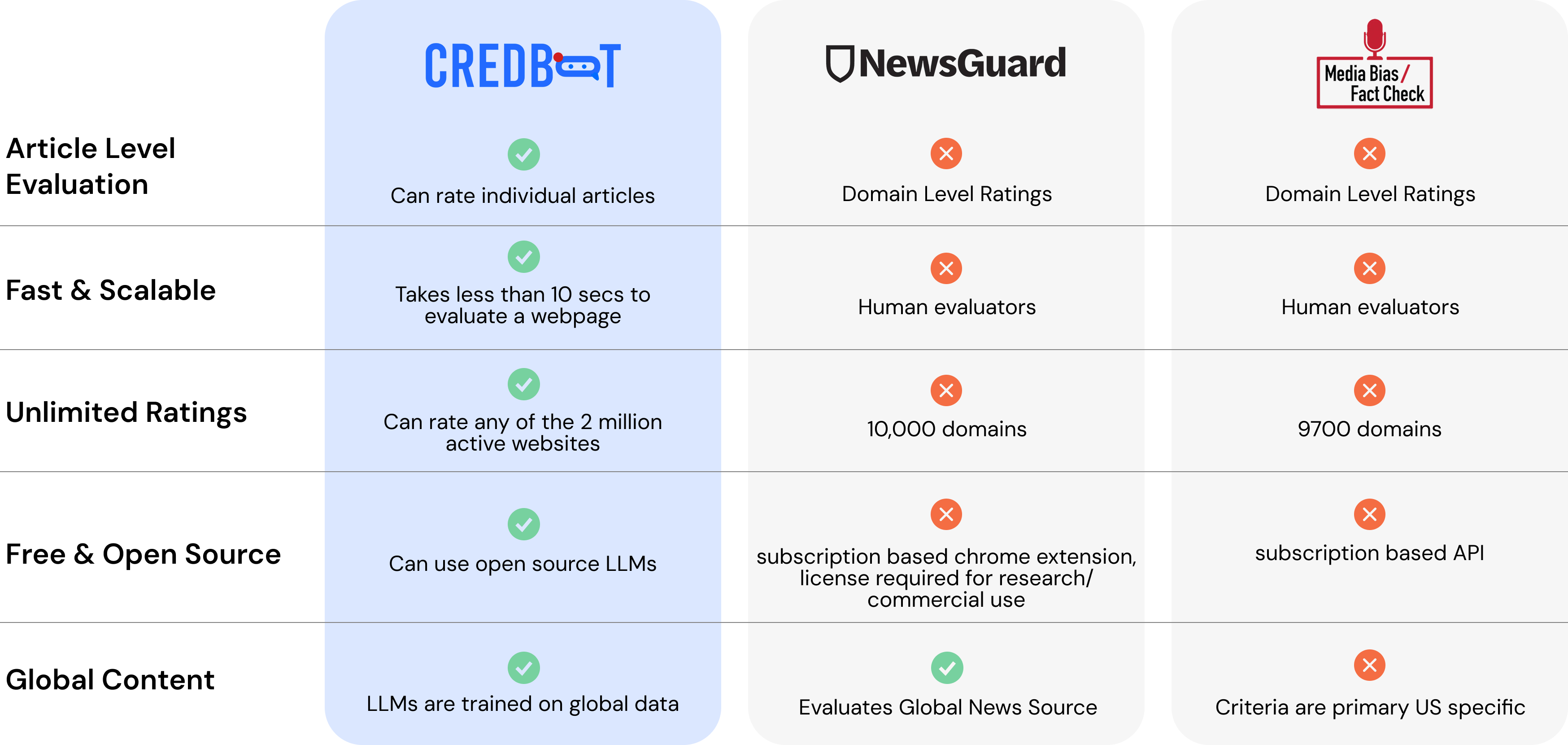 Existing tools depend on expert human evaluators, only has evaluation of a small portion of the 2 million active website, and only provide domain level credibility scores or labels, instead of evaluating the specific article a user is reading.