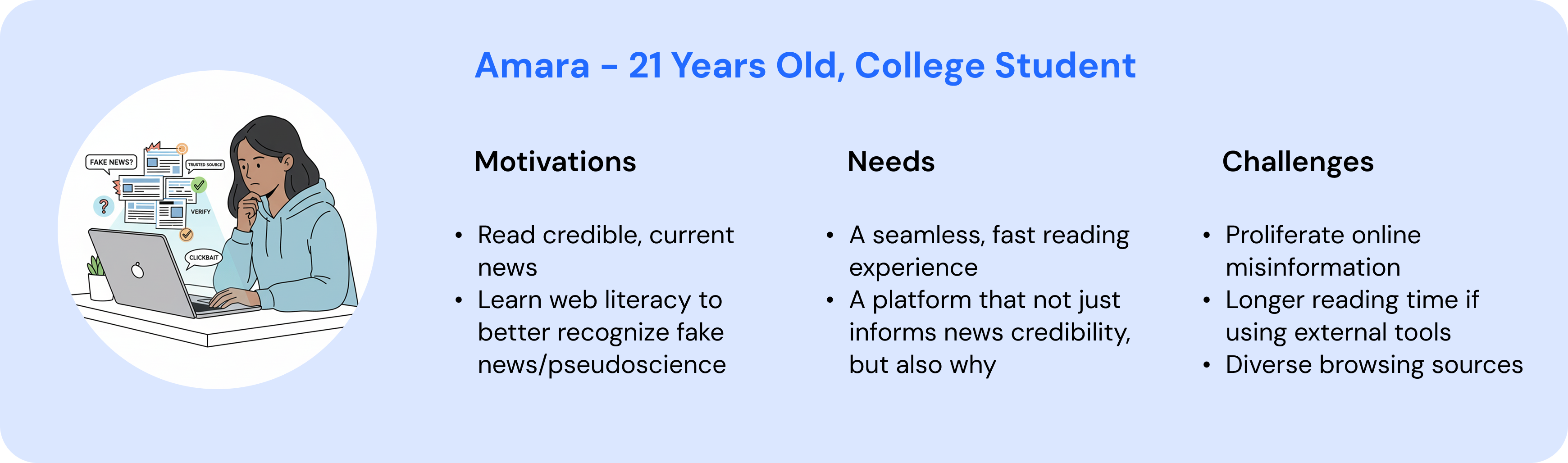 We decided to go for Chrome Extension because of its accessibility and relatively low development time, while keeping in mind the drawbacks of longer reading time to later address in our design.