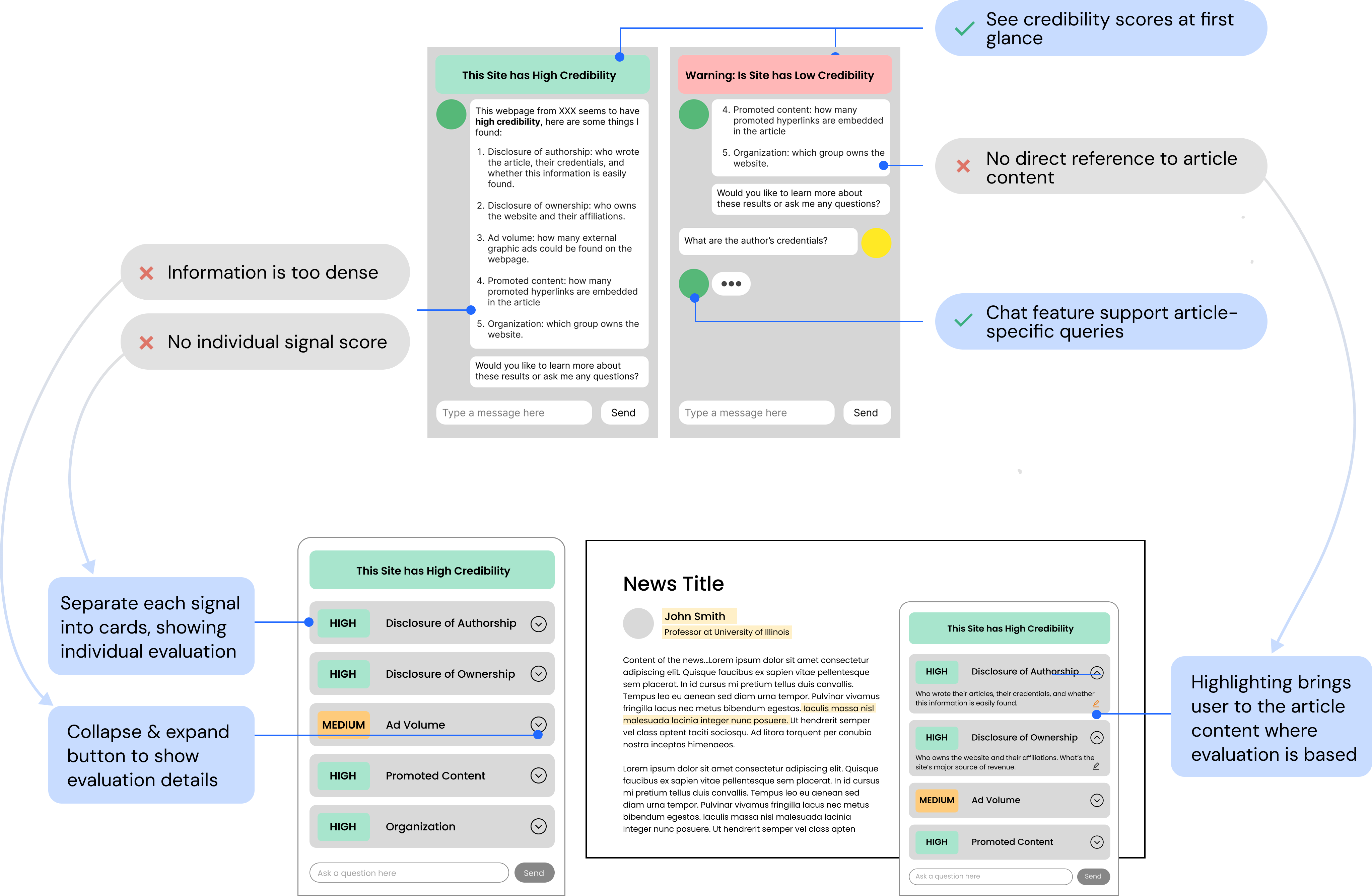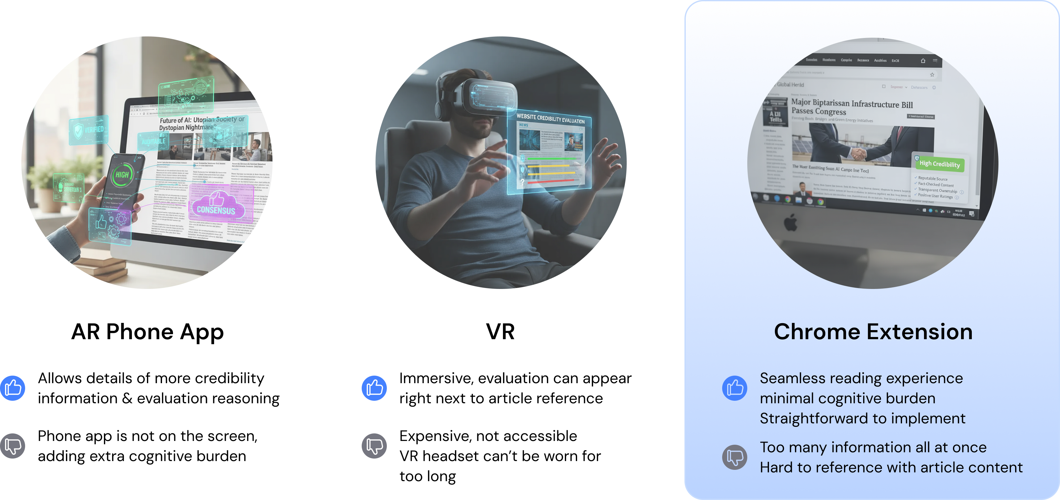 We explored multiple potential medium of CredBot, including AR Phone App that with credibility ratings on the phone, VR web browsing, and Chrome Extension.