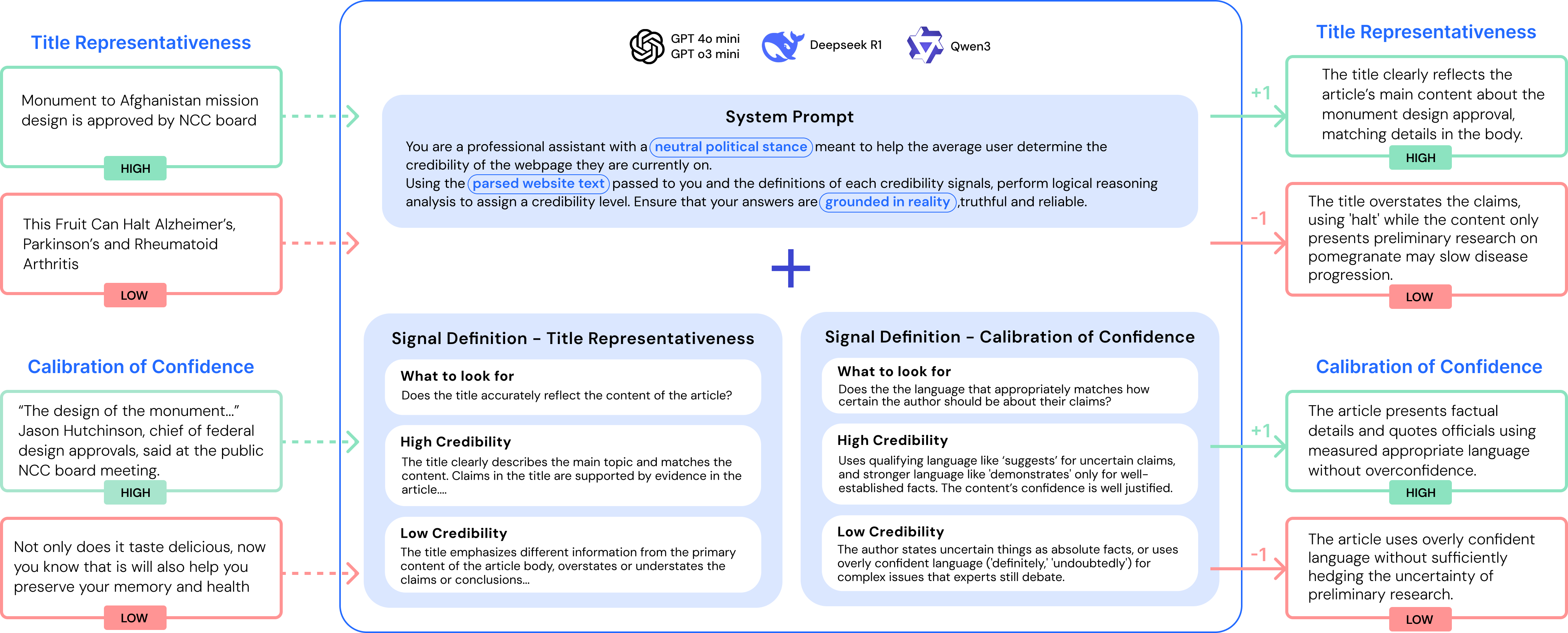 To increase accuracy for LLMs, we implemented an overall system prompting instructions, and concurrently evaluate each signal mapped to a prompt. Below are examples of inputs and outputs for 2 signals: Title Representativeness and Calibration of Confidence. We experimented with both commercial LLMs like GPT 4o mini and GPT 3o mini, and Open Source LLMs Deepseek R1 and Qwen3.