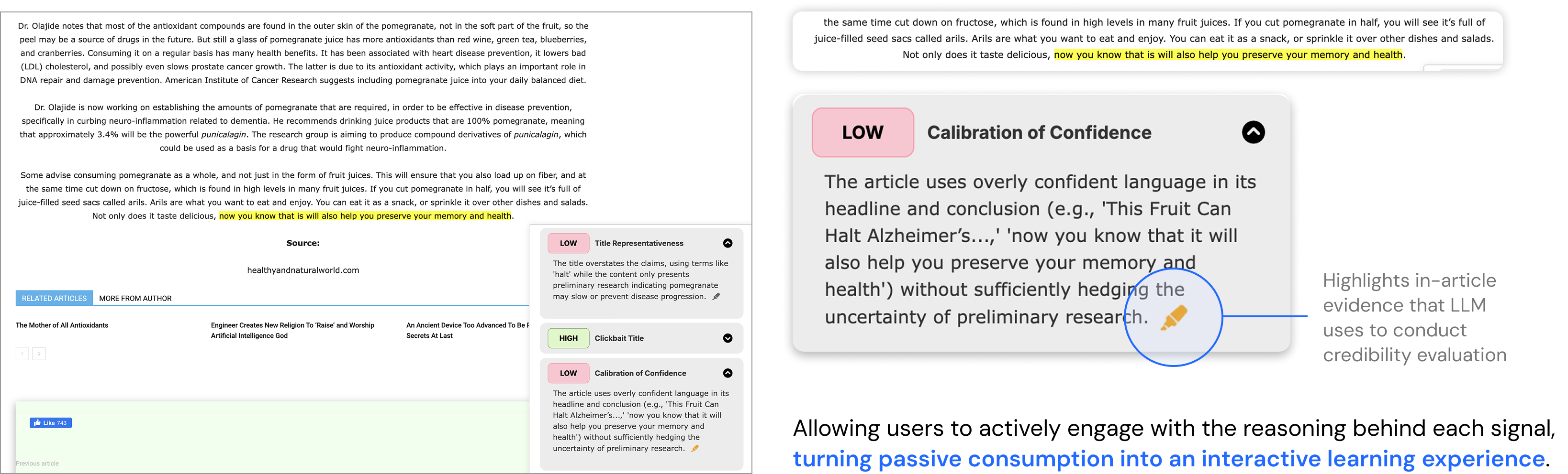 We ask: Can LLMs perform human-aligned credibility assessments at the article level, and how can interface design foster critical engagement rather than blind trust?