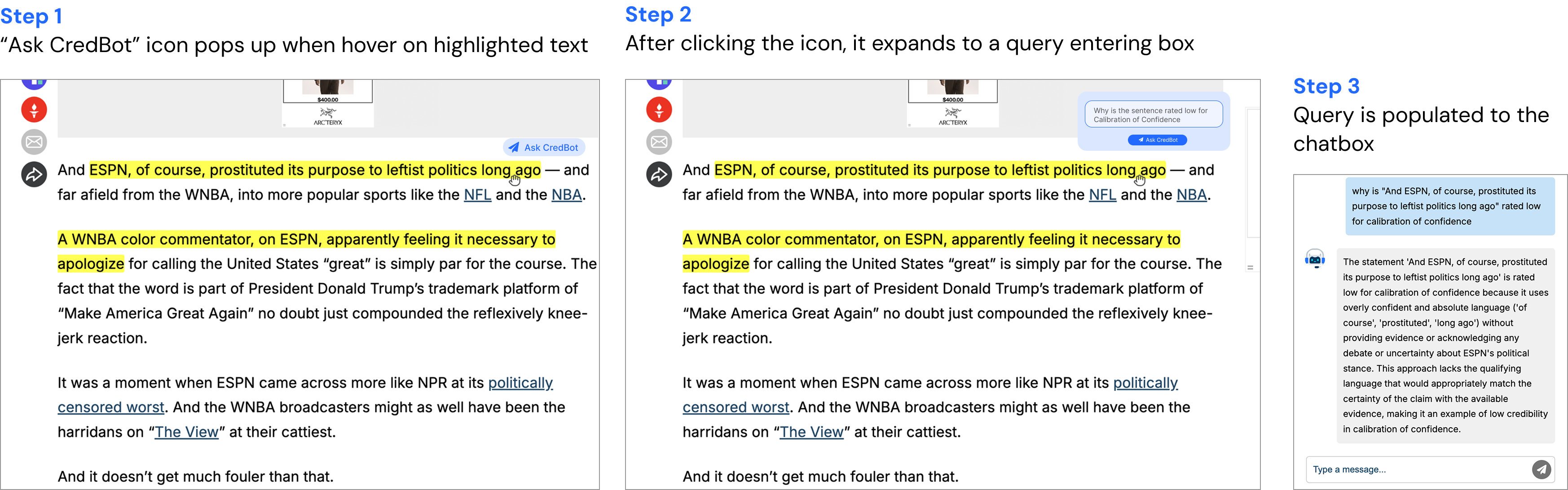 Overall, CredBot demonstrates the potential of LLMs to perform article-level credibility assessments in a scalable and cost-effective manner. By automating evaluations typically performed by human experts, CredBot offers a practical alternative designed to assist and educate users rather than replace human judgment. CredBot achieves up to 0.7 in IRR with our human evaluators, laying ground-work for future research on AI-driven solutions for online credibility and illustrating the potential of LLMs to interpret complex credibility signals effectively.