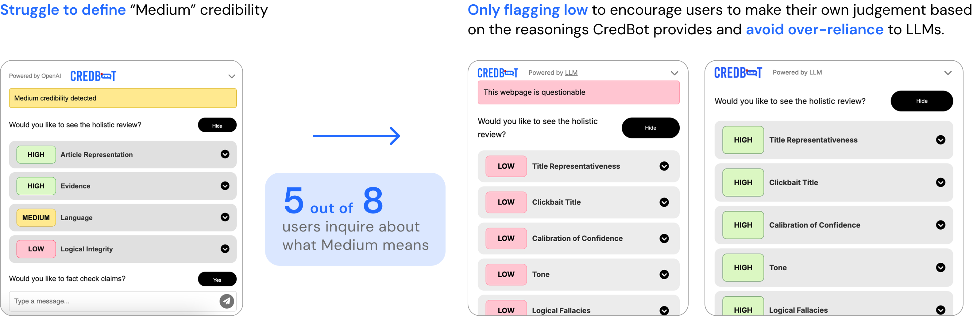 We tested CredBot’s architecture with five LLM models: GPT-4o, GPT-4o mini, o3-mini, Qwen3, and DeepSeek-V3. These models were chosen to test a range of cost, accessibility and efficiency. We calculate the IRR score to assess each LLM’s agreement with the ground truth. The results in table below show moderate agreement for GPT-4o-mini, and substantial agreement for GPT4o, o3-mini, Gwen3 and DeepSeek-V3. These agreement rates validate that LLMs can correctly interpret credibility signals within the same analytical frameworks used by labellers, and highlight open source models’ potential as capable alternatives to commercially available LLMs.