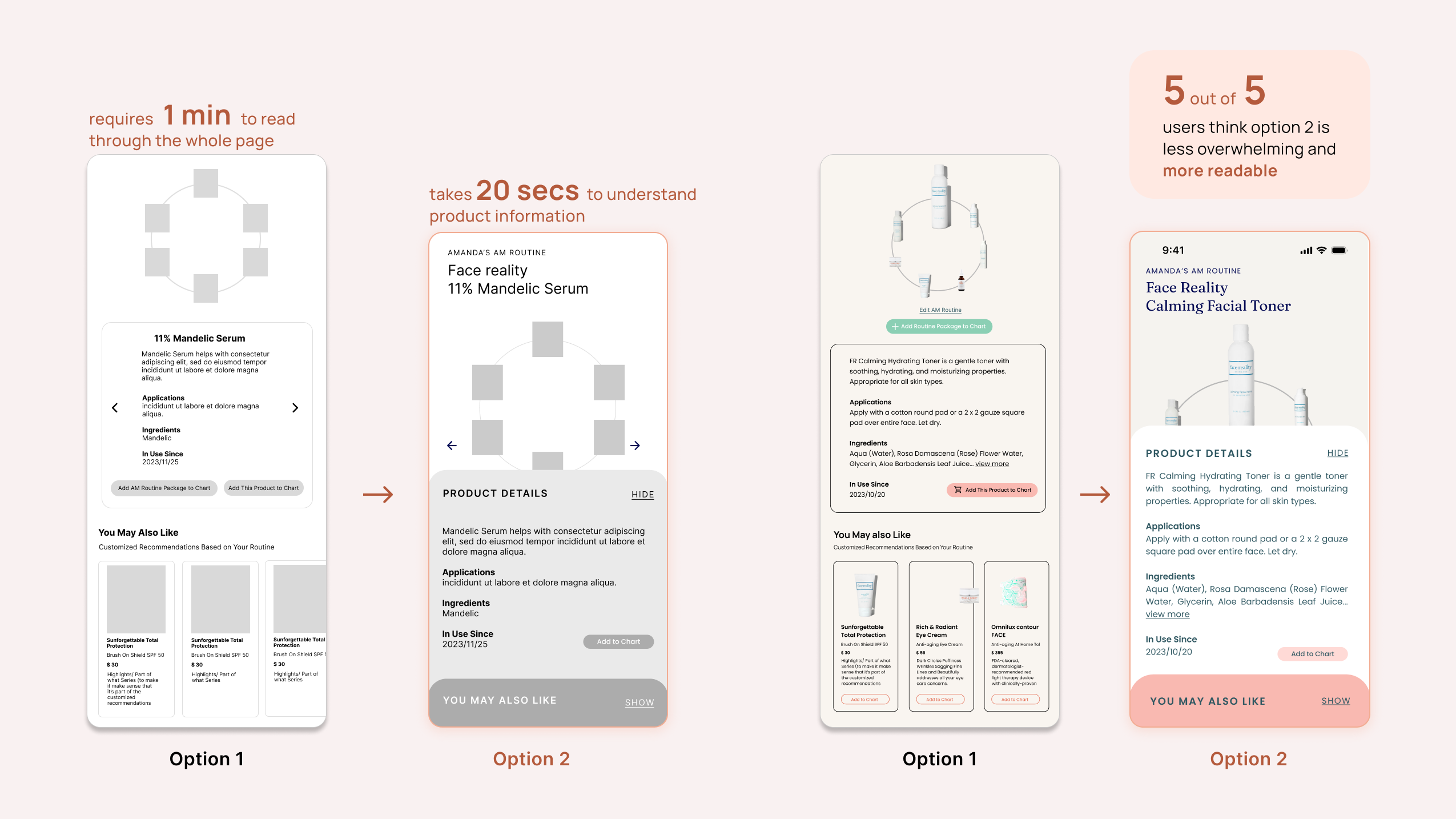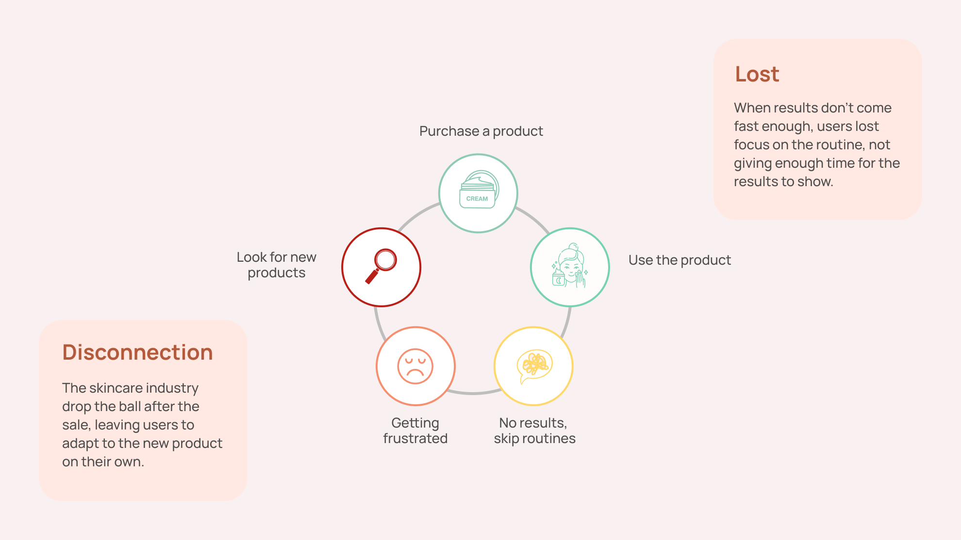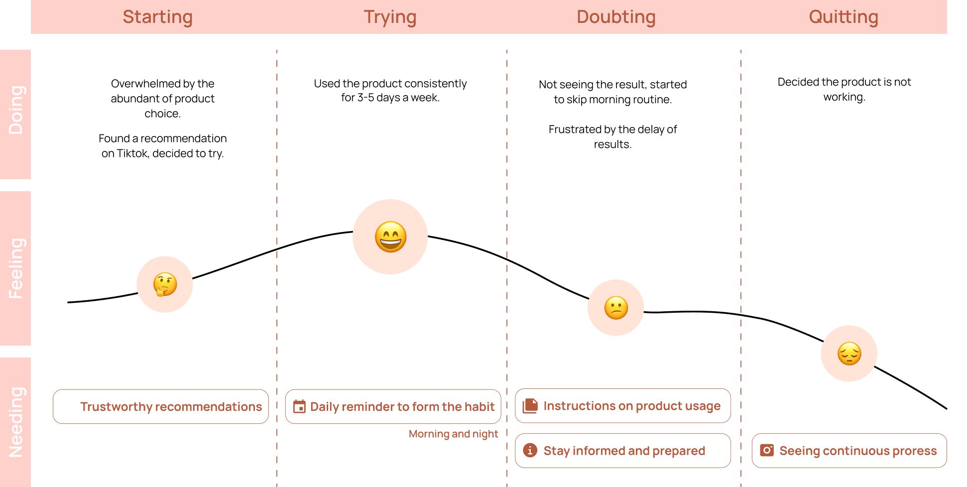 This is an overview of skincare users’ life in the journey for trying new skincare routine for their existing skin problems. The user scenario helps identity the needs of skincare users and what are strongest pain points we can improve upon.