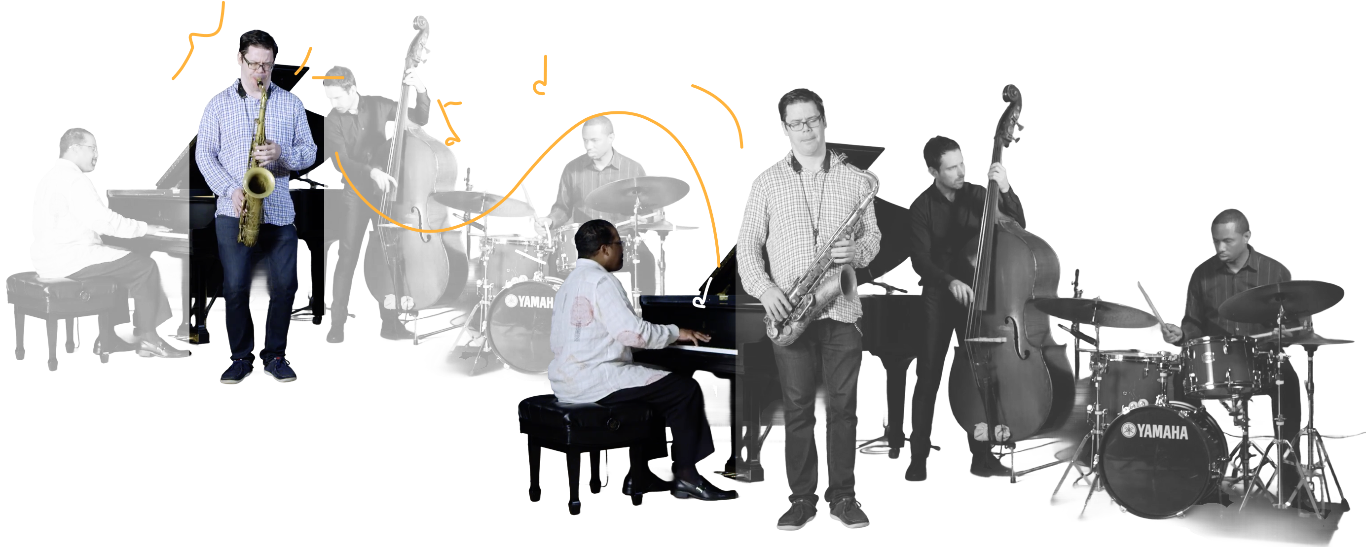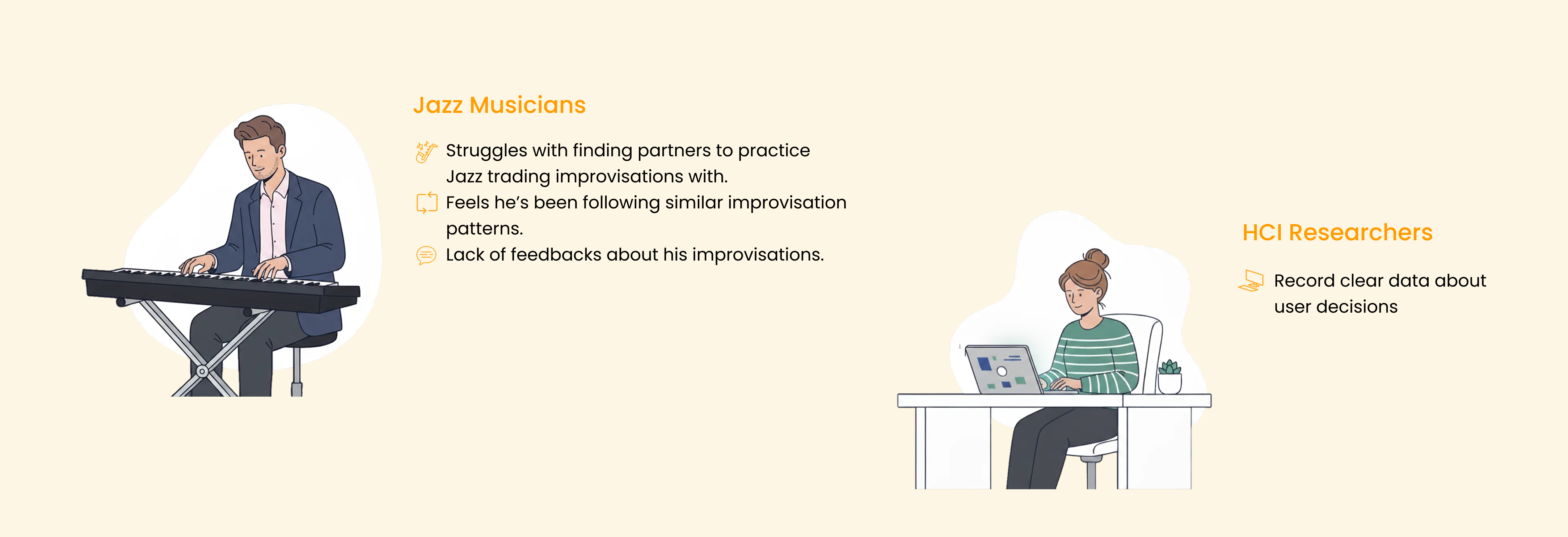 Jazz improvisation is deeply interactive: a call-and-response between musicians who build on one another’s ideas in real time. Yet, when practicing alone, musicians often lack that dialogue which nurtures creativity. Current practice tools exists, but they are static and predictable. The photos above show the pianist and saxophone taking turns to improvise, responding to each other dynamically, receiving feedbacks from the band.